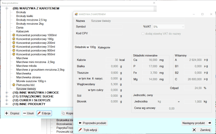Każdy produkt jaki wprowadzamy do magazynu musi mieć swoją definicję: ilość składników mineralnych, witamin,... w 100 g produktu, przydział do kategorii żywieniowej